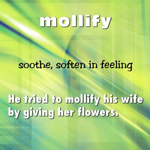 (+ object) to make (someone) less angry : to calm (someone) down He tried to mollify his critics with an apology. All attempts to mollify the extremists have failed. The landlord fixed the heat, but the tenants still were not Read More …